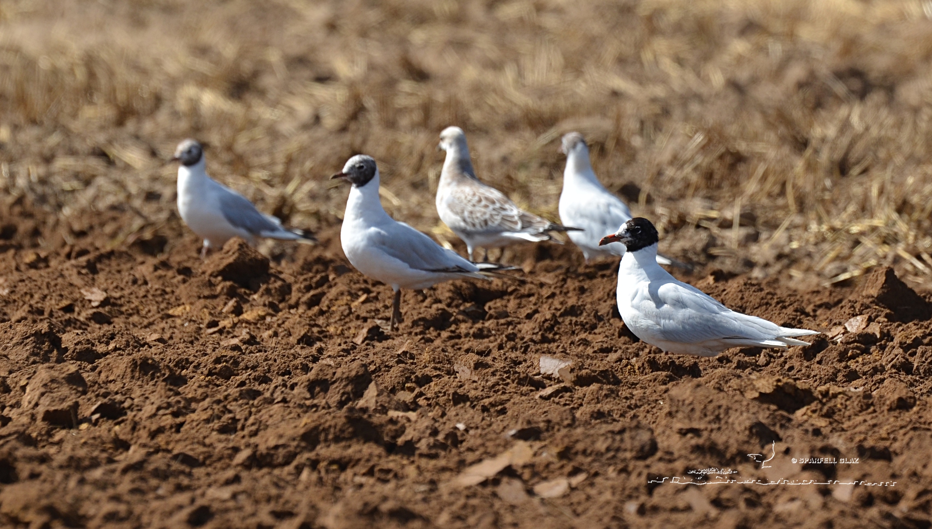 346-04 : dès début juillet, la mue estompe les couleurs mais les différences de formes et de couleurs se voient encore bien. À droite, la Mouette mélanocéphale a un capuchon qui descend très bas sur la nuque tandis que ceux des deux Mouettes rieuses ne viennent que jusqu’à l’arrière du crâne et sont d’une teinte bien plus chocolat. L’oiseau au dos bariolé de brun est une Mouette mélanocéphale juvénile.